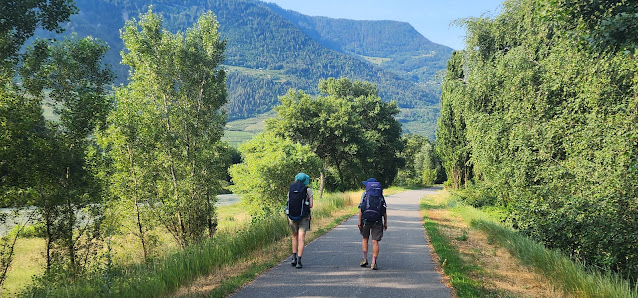 After yesterday's jaunt through the vineyards, today we headed back to the Rhone. We followed cycle and walking paths along the river as far as Évionnaz before finishing the last few kilometres into St Maurice on the Via Francigena.